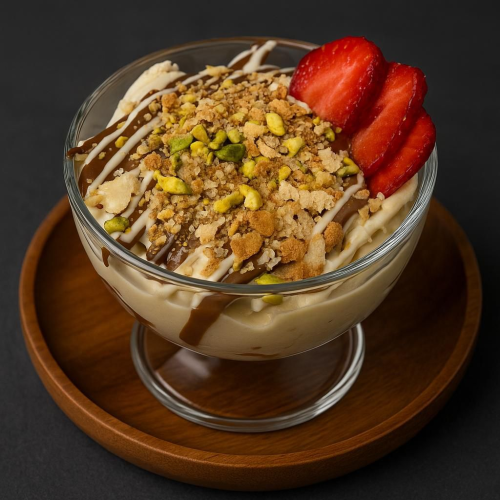 Bardak içerisine ıslak kek, dondurma, çilek ve sütlü Belçika çikolatası, üzerine Çıtır Krep kırıkları ve Antep fıstığı ile servis edilir.